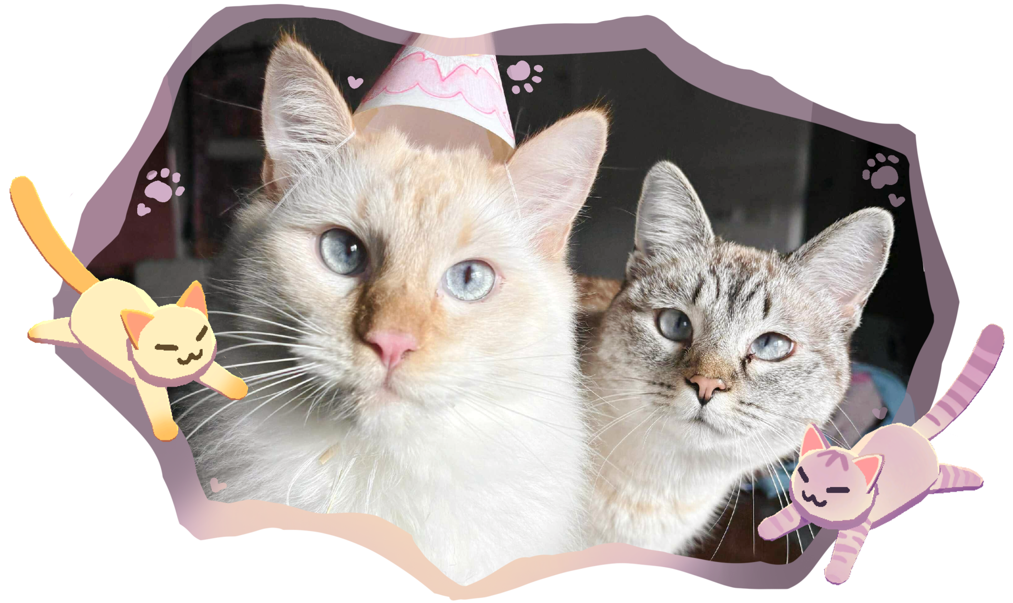 Our cats Celestine and Nikko are meowing for playtime and treats! Uhhh, they're also shedding a lot- clear the fur, throw the yarn, and protect the treats for as long as you can until all the cats are happy!
